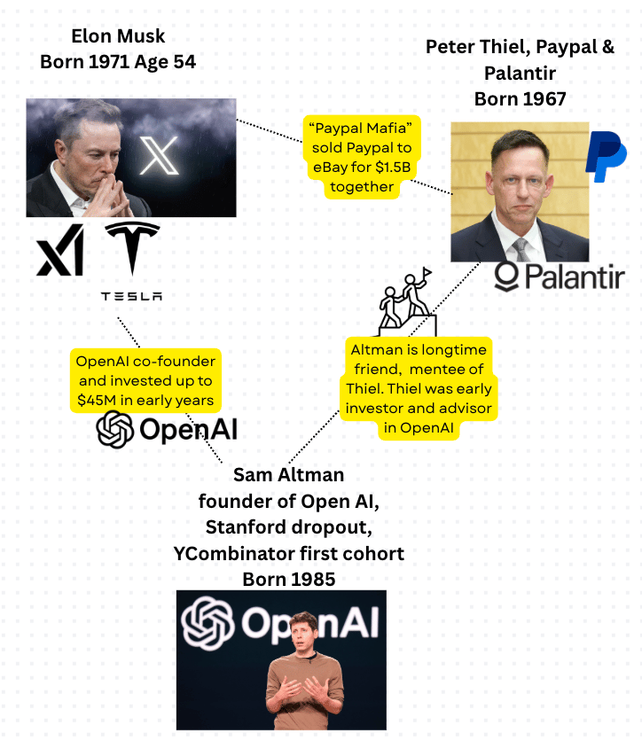 Did you know Peter Thiel, 58 y.o. billionaire, German and American co-founder of PayPal (1997) and current town-cryer about the AntiChrist, is one of Sam Altman’s closest friends and mentors? Thiel is a noted contrarian, Trumpist libertarian, and math prodigy, with a law degree who also founded Palantir in 2004 (yes, surveillance state Palantir) at the same time as he became Facebook’s first outside investor (because he was also Mark Zuckerberg’s mentor 😭). He famously doesn’t know if he thinks humanity should persist, he’s not a big fan of democracy, and preaches the only way to build a company is to build a monopoly because “competition is for losers”. He’s actually one of the scariest people on this list (if not the scariest).