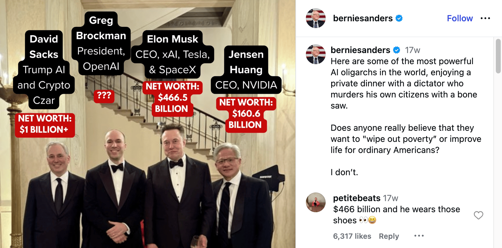 Larry Ellison (you may recognize his name because he became a key stakeholder in the Tiktok forced sale and he’s been trying to consolidate media power by buying Paramount) is 81 YEARS OLD with a shit ton of filler in his face. He’s an American who dropped out of college (maybe the original college drop out tech bro??) and has had SIX wives. He founded Oracle Corporation in 1977, a tech company specializing in software and cloud computing infrastructure. He’s been a billionaire for over 40 years and has become an outspoken supporter and friend of Donald Trump, using this relationship to skirt anti-monopoly flags for his Paramount acquisition earlier this year (allegedly, allegedly). Larry Ellison invested nearly $1B in Tesla, Elon Musk’s infamous car/tech company (depending on the day).