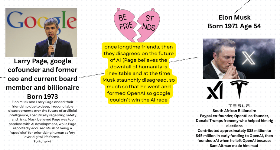Speaking of Elon: Elon Musk, 54 year old South African almost-trillionaire, came to the USA to finish his undergrad physics and economics degrees. He eventually founded a company called X.com (it’s different I checked), which was a sort of online bank situation that got acquired by PayPal, cementing him as a billionaire post-PayPal sale to eBay. I think we already know enough about him to realize that if he’s at the start of this story, it can’t be going anywhere good. And it’s my view he’s at the start of this: It’s been widely reported that at Elon’s 44th birthday party, he got into an argument about the future of AI with Larry Page, co-founder and then CEO of Google.